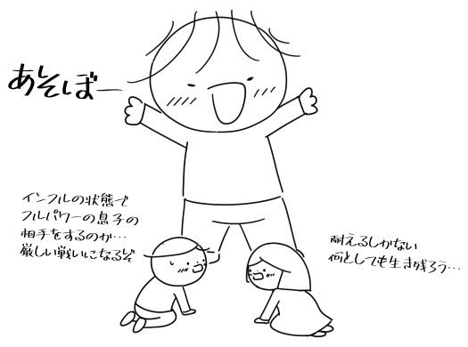 インフルで戦闘力が10分の1になった妻と私で、インフルから全回復し具合が悪かった時間を取り戻すかのような生命力に溢れる息子と対峙。