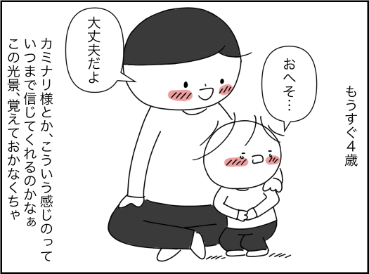 「カミナリ様がゴロゴロ〜って言いながら俺のおへそを探してるよ」って泣きそうな顔で近づいてきて、私のそばを離れない息子の姿。